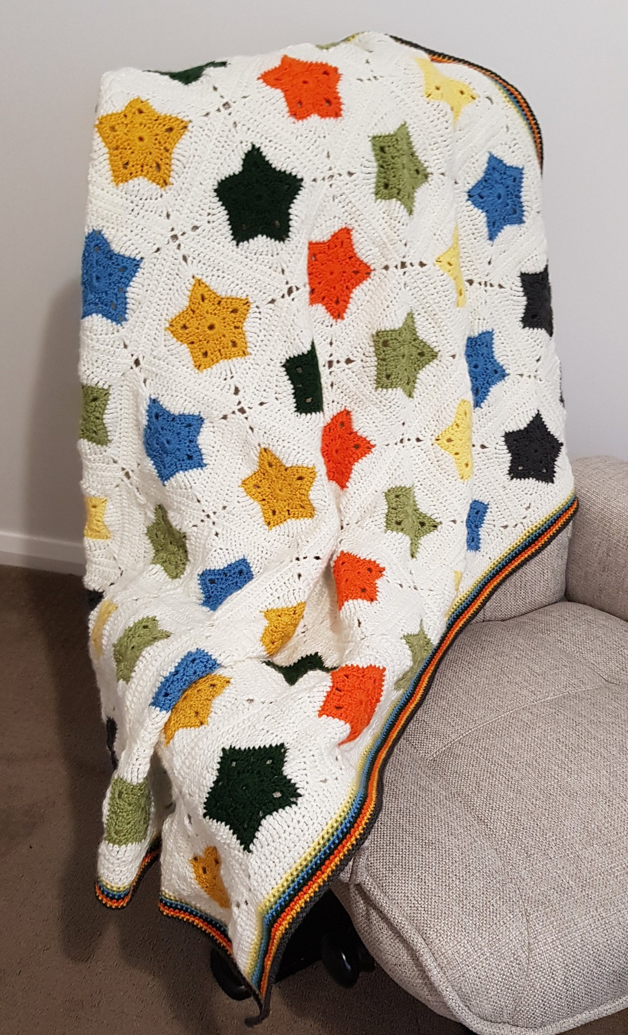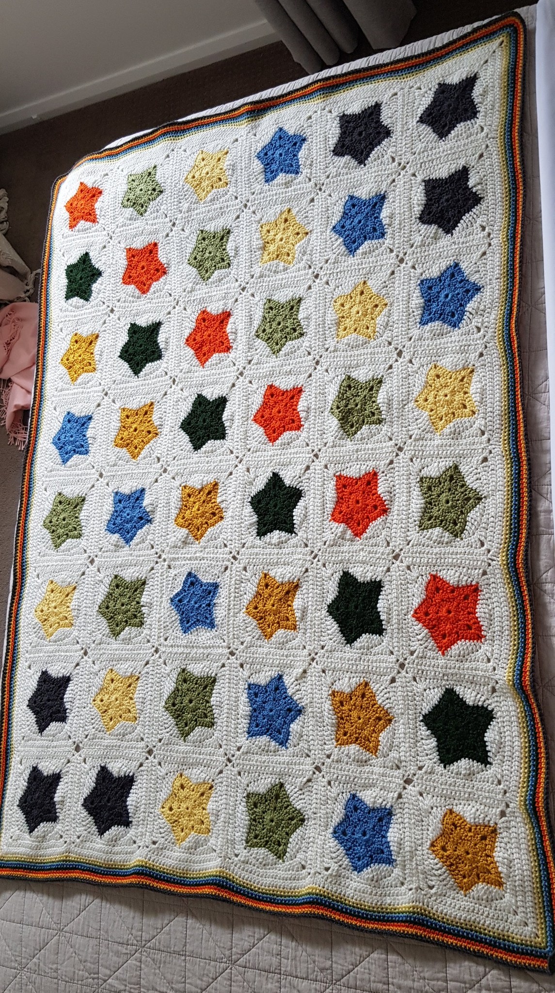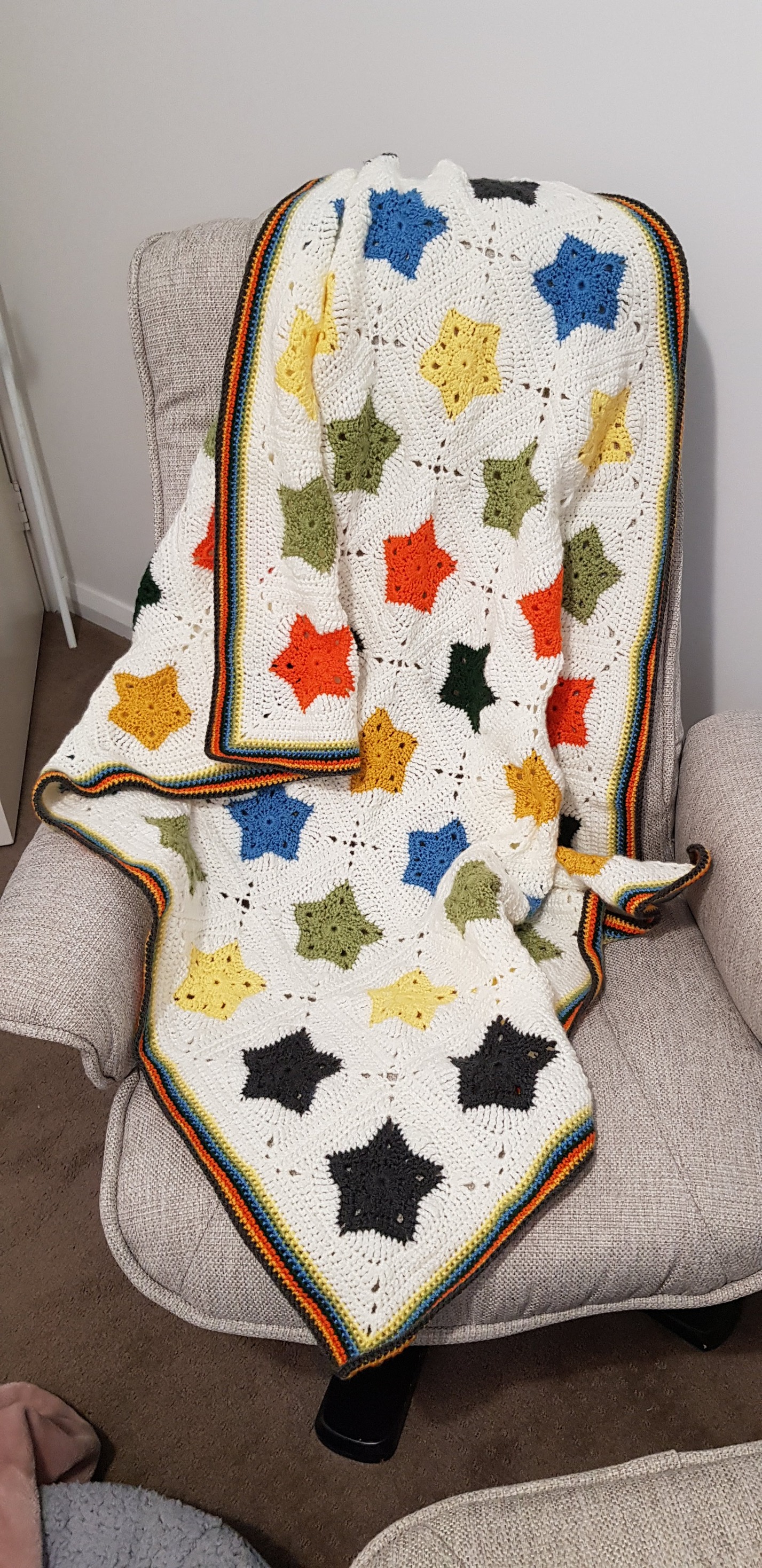 Ok….so remember I mentioned the epic baby blanket I was working on? It was a special order. I finished it (finally) just before Xmas and here are the pics. It is called the Rainbow of Stars Blanket. It was made with much love for a friend to gift to her daughter who is expecting her first child – a boy – in April. I am really pleased proud of how this turned out.