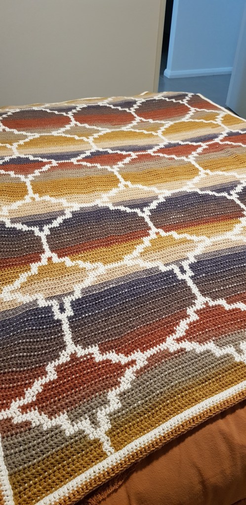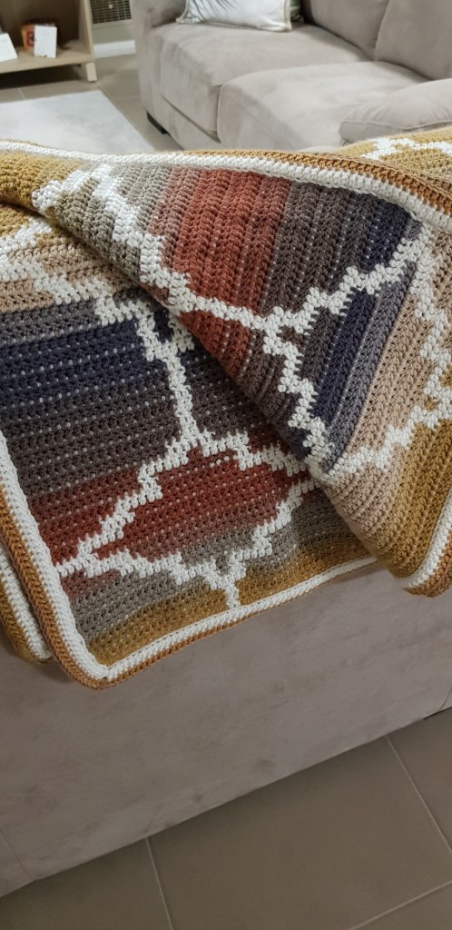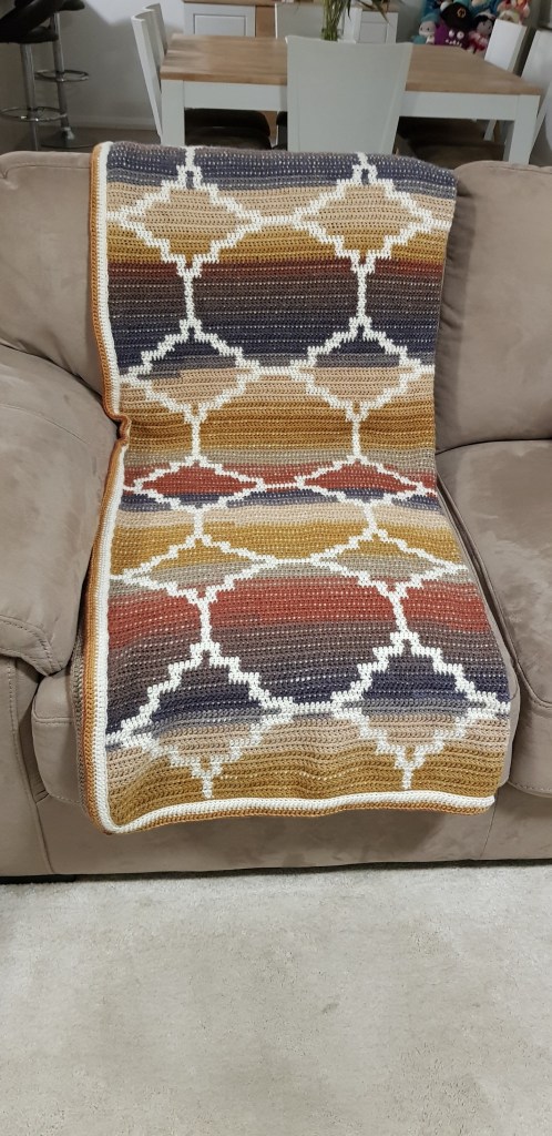 Latest finished blanket project. This one is one I made for hubby quite some time ago. I hated it because I didn’t like how the edges looked. I pulled it out of the cupboard a few weeks ago with the intention of unravelling it to re-use the wool, but Chris loves it so I decided to figure out a way to crochet a new border – one that I was happy with. So… this is now the finished piece. I used a double border (AKA envelope border). It is very time consuming and complex for what looks to be such a plain border but so worth it as it gives the whole blanket a professional finish. This is now my new favourite. So glad I didn’t pull it all apart now!!
